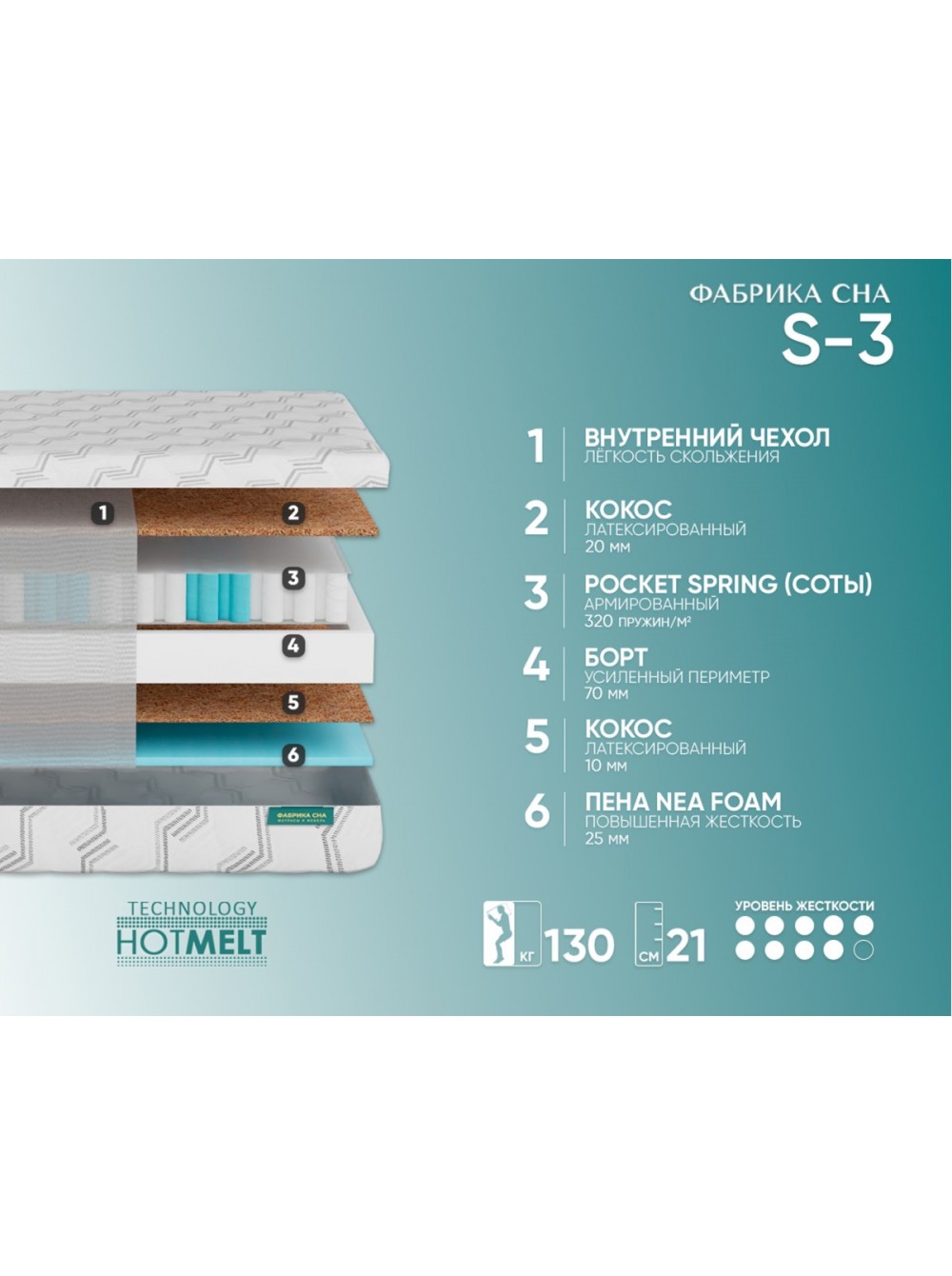 Евро периметр Система жесткого периметра матраса выполнена из пены высокой плотности. Располагается внутри матраса, создает идеальную форму его боковой части и дополнительно повышает жесткость краев, защищая их от проседания при нагрузках.