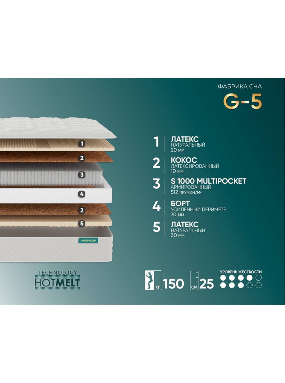 Матрас способствует идеальной поддержке всего тела  благодаря сочетанию слоев натурального латекса и кокосовой койры с премиальным независимым пружинным блоком Multipocket S1000.