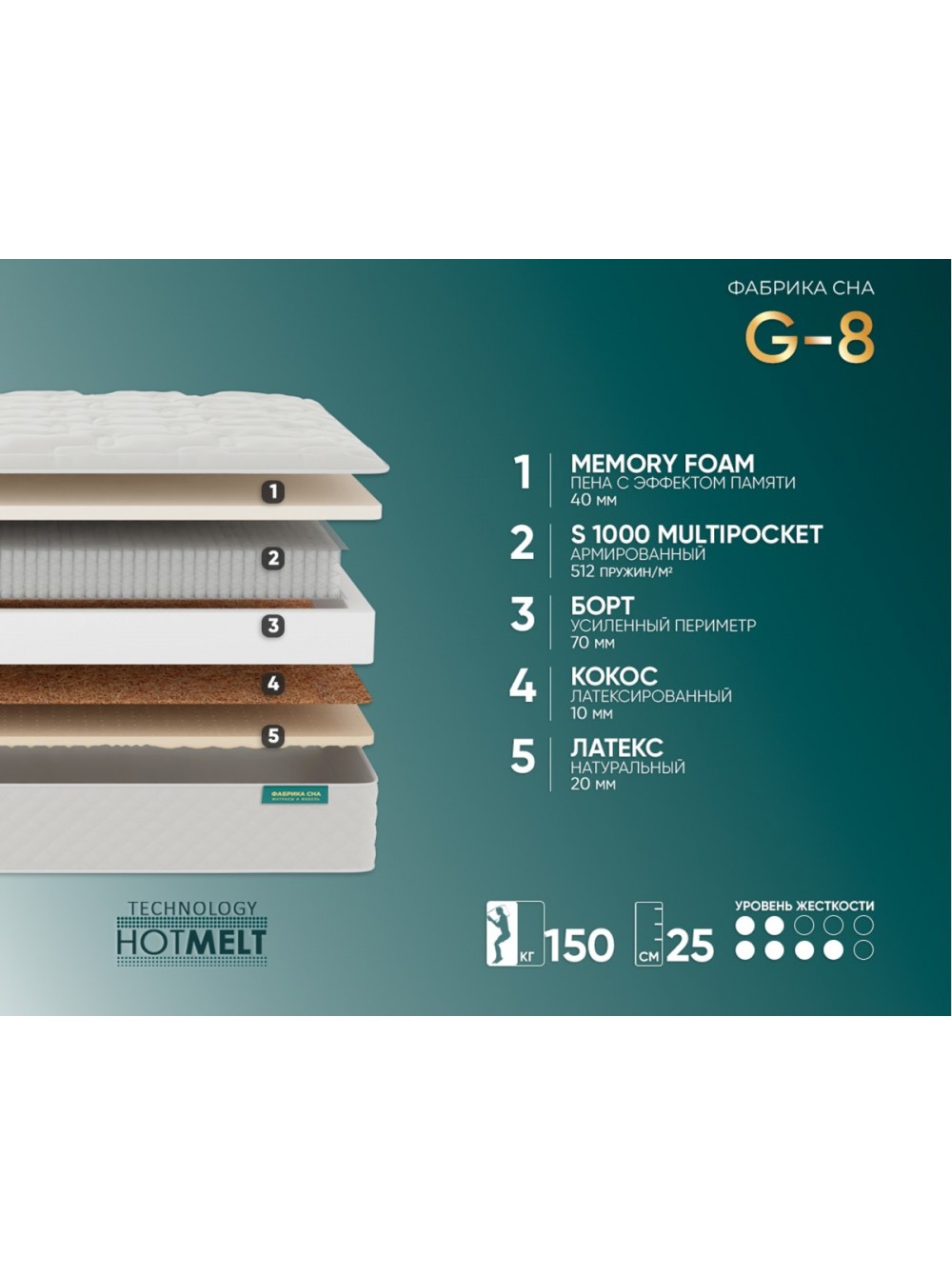 6. Евро периметр Система жесткого периметра матраса выполнена из пены высокой плотности. Располагается внутри матраса, создает идеальную форму его боковой части и дополнительно повышает жесткость краев, защищая их от проседания при нагрузках.